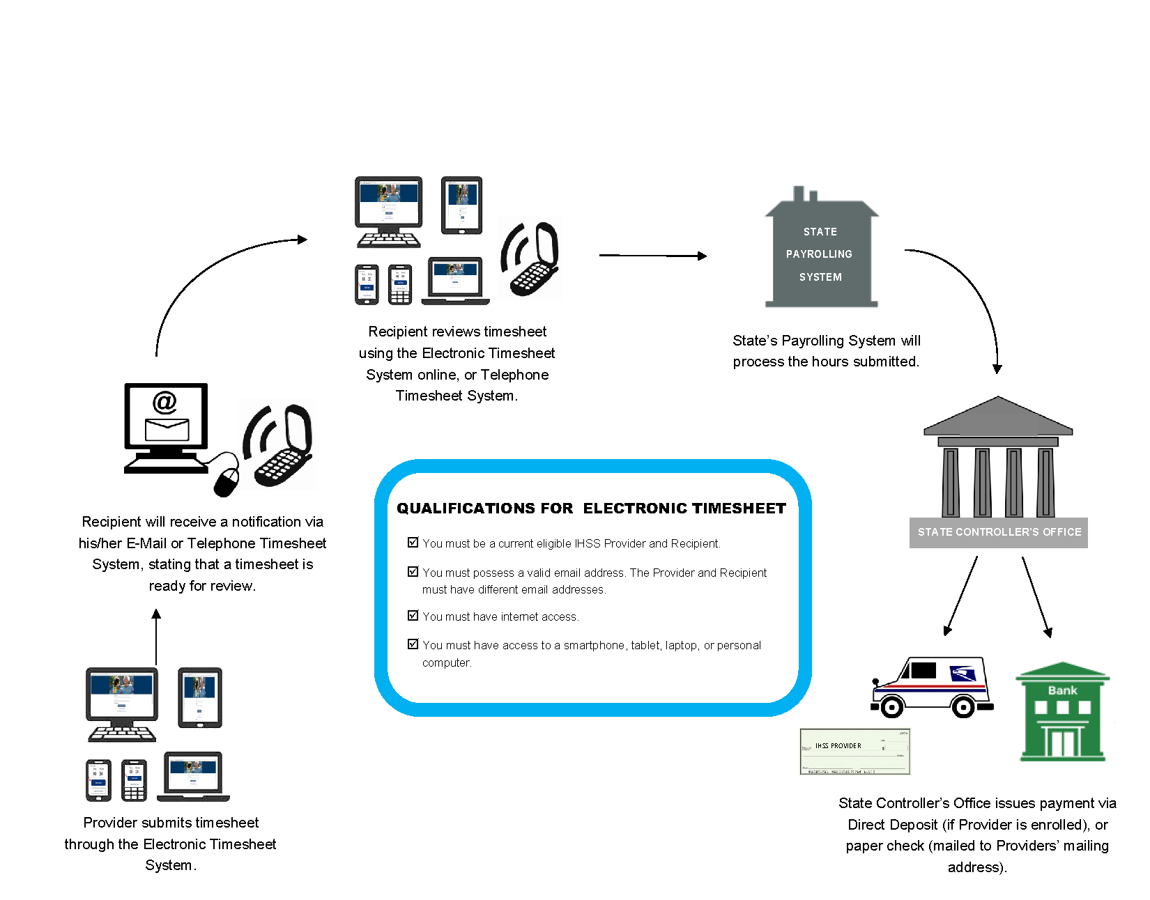 The state of CA has 10 business days to issue a payment from the date the timesheet is received at the timesheet processing facility in Chico, CA. If you have not received your check 10 business days after your check was issued, call the IHSS Payroll to request a Stop Payment of the check that was not received and have a new check reissued.